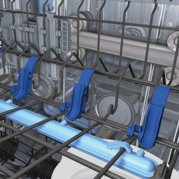 MultiWash: Không giống như các máy rửa bát thông thường chỉ có một vòi phun ở đáy, model này được tăng cường thêm 2 vòi phun phụ. Thiết kế này đảm bảo nước có thể tiếp cận và làm sạch chén bát ở mọi vị trí, ngay cả những góc khó tiếp cận nhất.