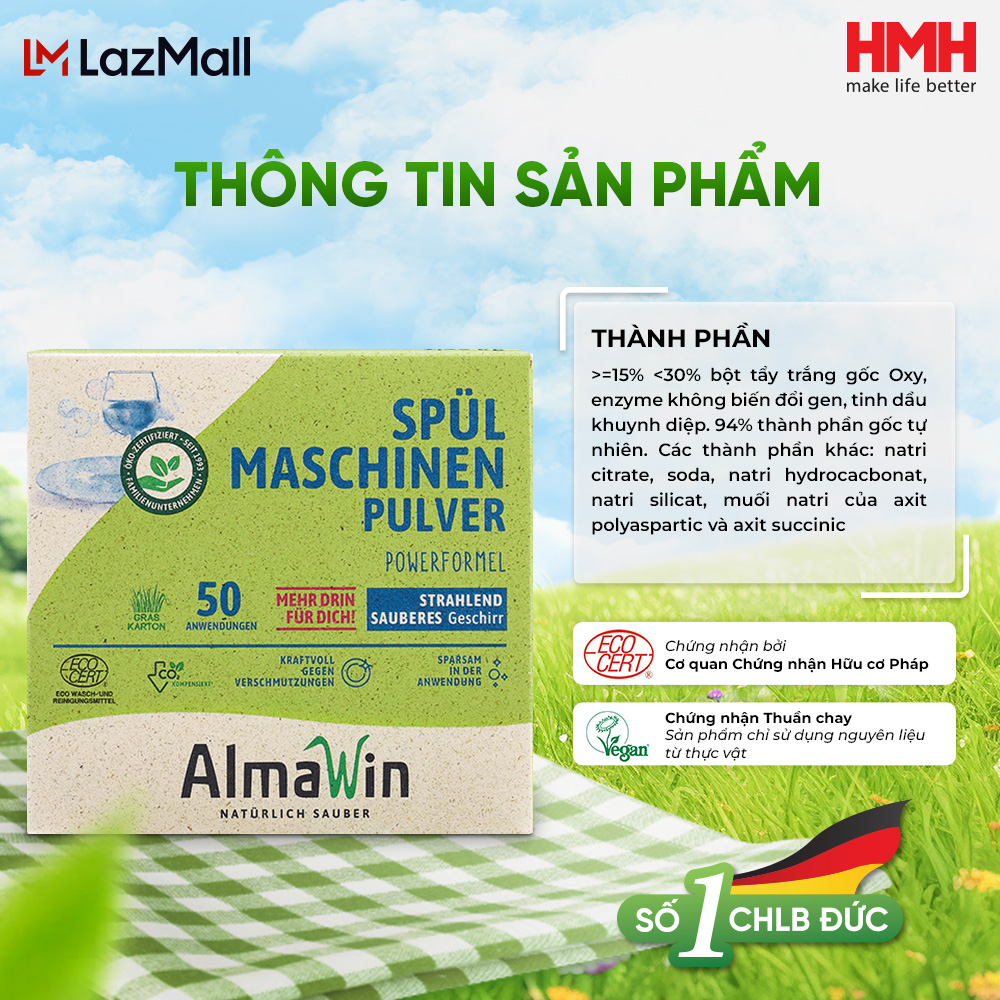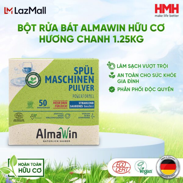 Bột rửa bát Almawin hữu cơ hương chanh là sản phẩm chất tẩy rửa hữu cơ cao cấp đến từ