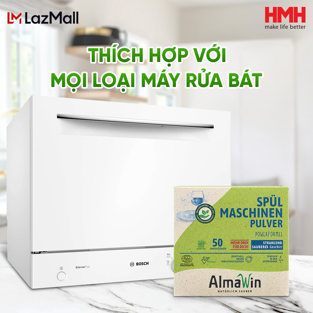 Bột rửa bát hữu cơ Almawin thích hợp sử dụng cho nhiều thương hiệu và chủng loại máy rửa bát: máy rửa bát độc lập, máy rửa bát mini, máy rửa bát để bàn, máy rửa bát âm tủ, máy rửa bát kết hợp chậu rửa…