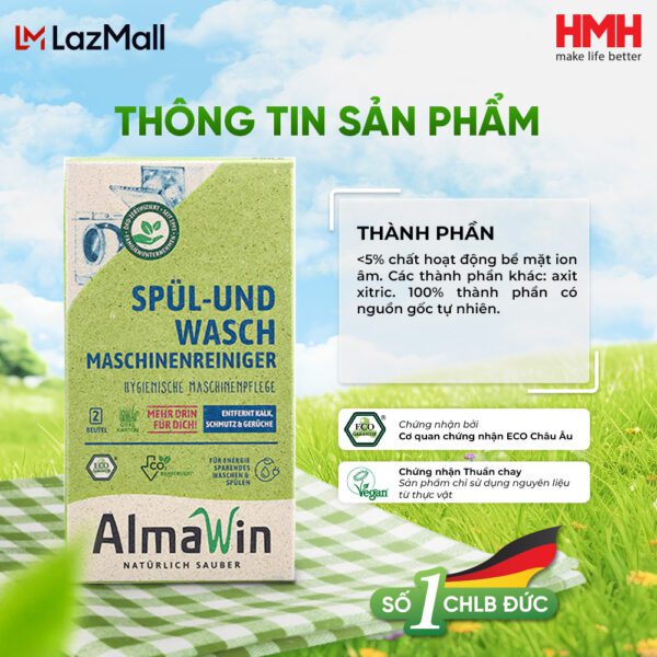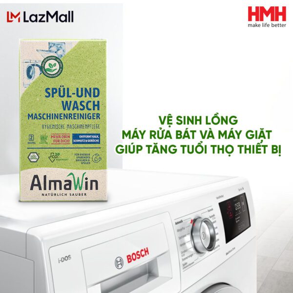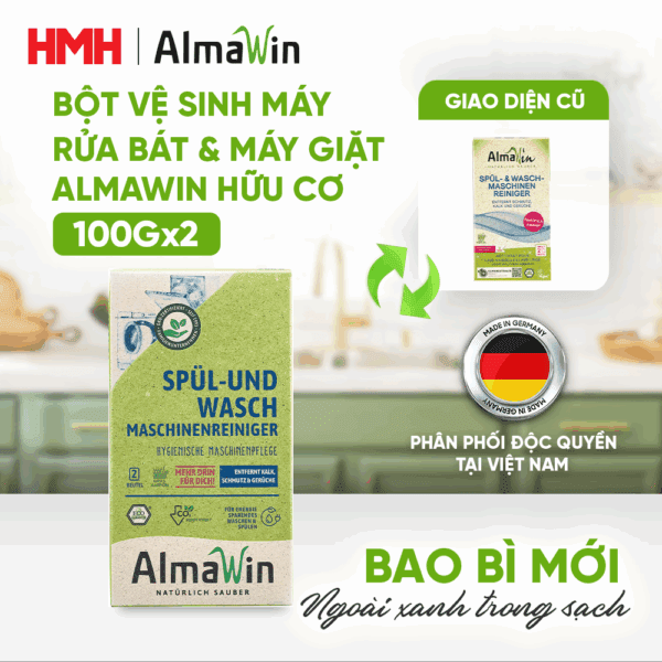 Bột vệ sinh máy rửa bát và máy giặt Almawin là sản phẩm có nguồn gốc từ Đức, với các