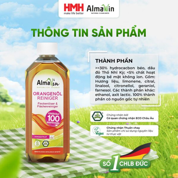 Sản phẩm nước tẩy đặc biệt Almawin hữu cơ hương cam 500ml có chiết xuất từ thiên nhiên. Thuộc nhóm sản phẩm vệ sinh đặc biệt, công dụng chính của sản phẩm gồm: